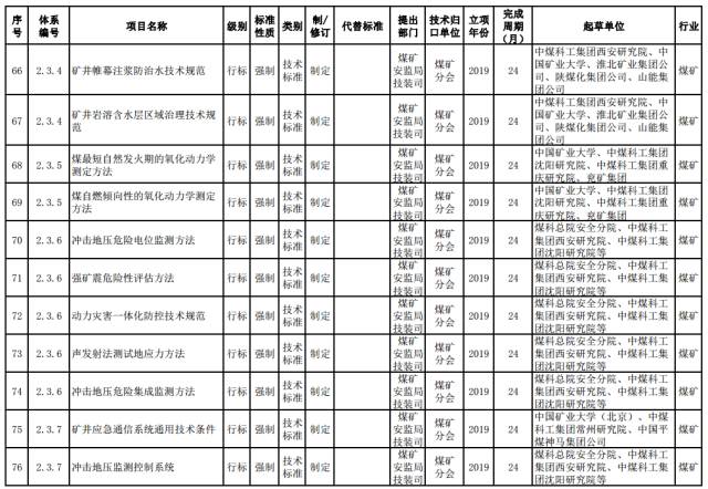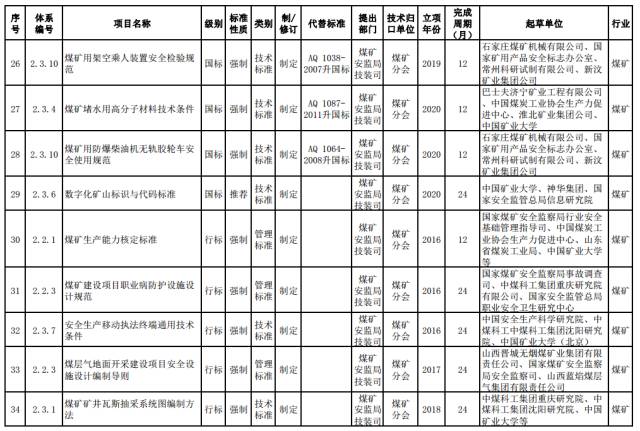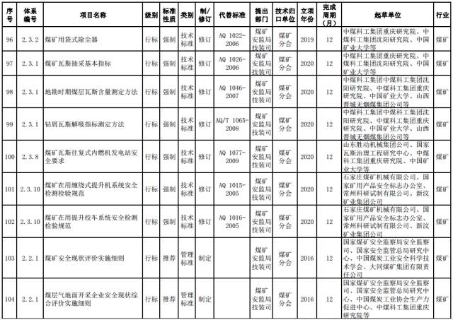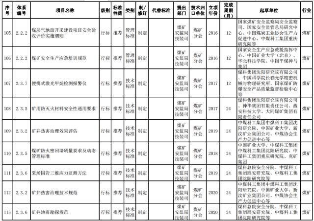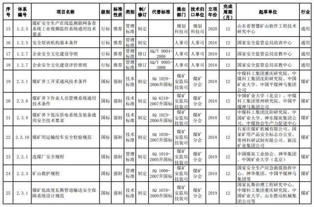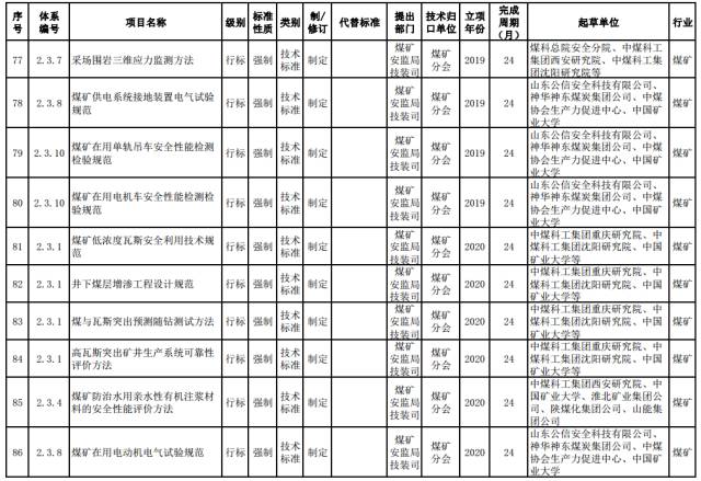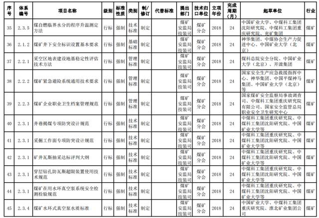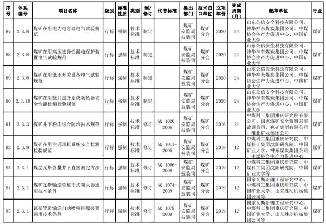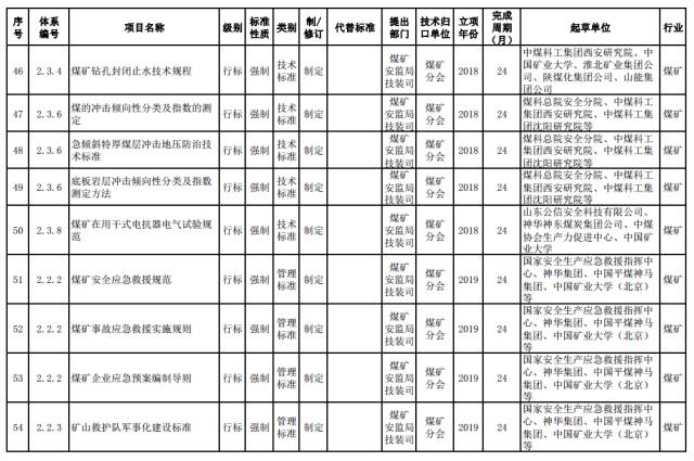 煤矿强制性标准。制修订煤矿安全准入、通风、瓦斯防治、火灾防治、重大隐患分级、粉尘防治、水害防治、顶板控制与冲击地压防治、热害防治、应急救援与个体防护、煤矿生产能力核定、职业健康等方面的通用安全技术要求和管理要求。