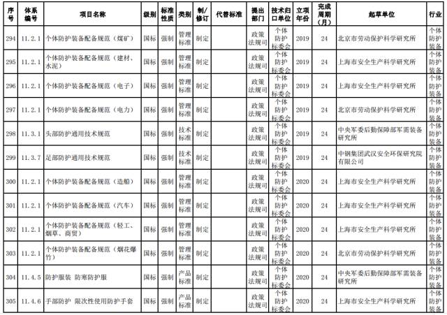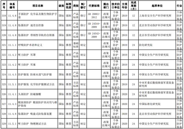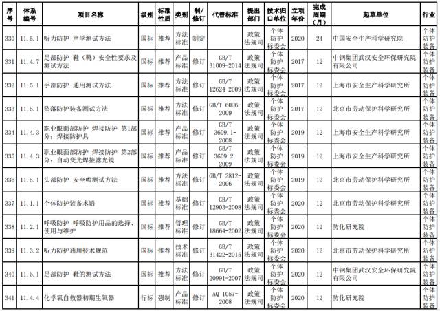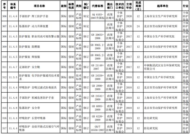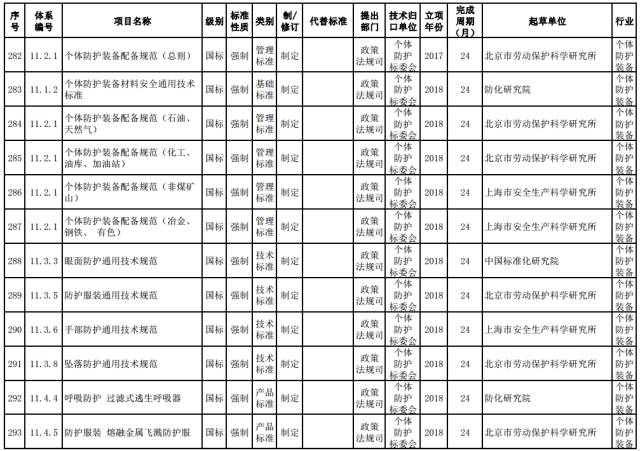 个体防护强制性标准。制定呼吸防护等八类防护通用技术规范,个体防护装备材料安全通用技术要求,石油、化工、非煤矿山、冶金、建材等行业领域配备标准,熔融金属飞溅防护服、坠落防护动力升降装置等产品标准。修订阻燃服、焊接服、自吸过滤式防毒面具、长管呼吸器和安全带等产品标准。