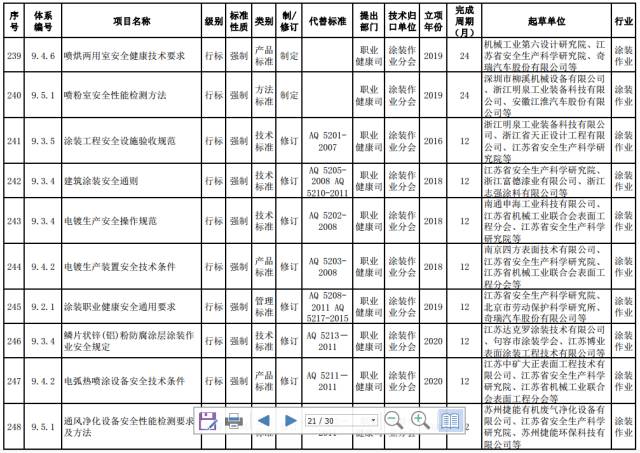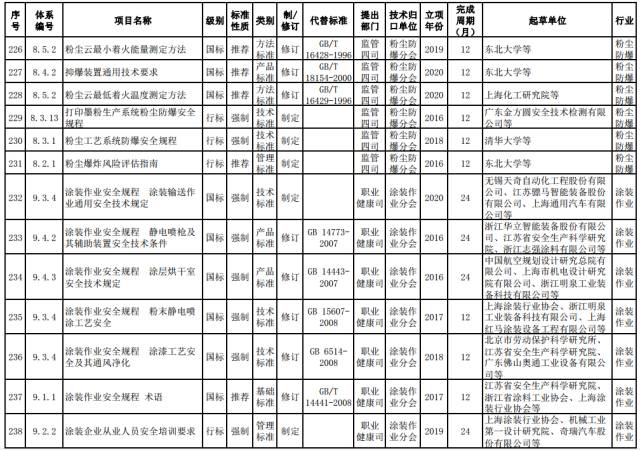 涂装作业强制性标准。制定涂装输送作业通用安全技术标准。修订静电喷枪及其辅助装置安全、涂层烘干室安全、粉末静电喷涂工艺安全、涂漆工艺及其通风净化安全等标准。