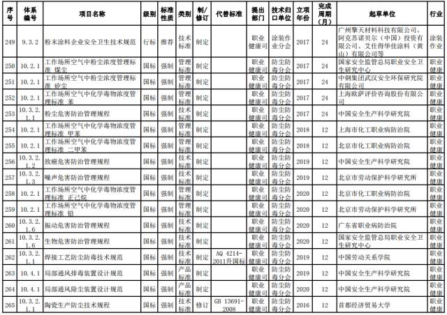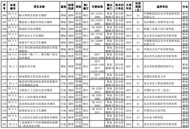 职业健康强制性标准。制定建设项目职业病危害控制效果评价及检测标准。修订石材加工、制革、电子工业、家具制造业防尘防毒技术标准。