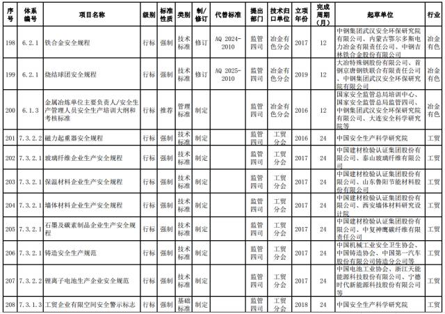 冶金有色强制性标准。制定金属冶炼建设项目安全评价和安全设施设计专篇编制等管理标准,高温熔融金属及熔渣盛装、运输容器和锑冶炼安全技术标准。修订铁合金、烧结球团安全技术标准。