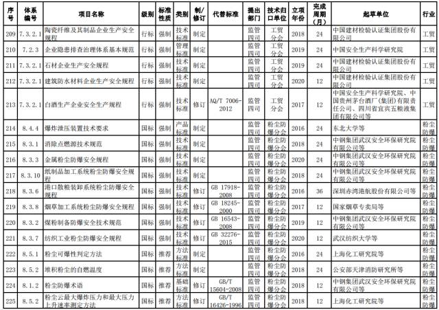 粉尘防爆强制性标准。制修订煤粉制备、金属加工、港口散粮装卸、纺织工业、烟草加工、纸制品加工等行业领域粉尘防爆安全标准。制定消除点燃源技术规范,爆炸泄压装置技术要求。