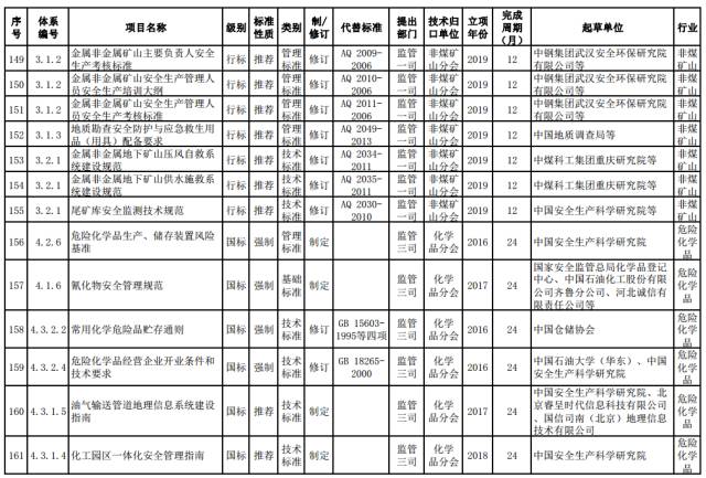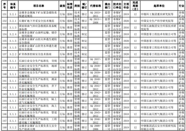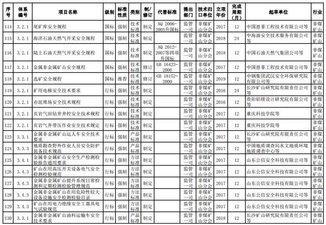 非煤矿山推荐性标准。制定金属非金属地下矿山采场稳定性和采空区安全等管理标准,金属非金属矿山油料运输、储存和使用标准,矿井热害控制技术标准,金属非金属矿山防突水、防火及逃生避险技术标准,国家级油气田应急救援队装备配备标准。修订金属非金属地下矿山紧急避险系统建设标准。