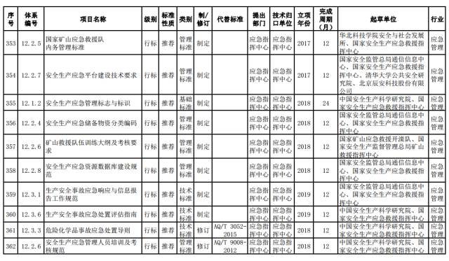 应急管理推荐性标准。制定应急准备情景构建和应急准备评估等标准,应急信息平台建设标准,国家旅游应急救援队伍装备配备和隧道坍塌应急救援配置标准,危险化学品应急救援基地建设及队伍建设标准,矿山救援队和危险化学品应急救援队训练标准,应急管理术语、标志与标识、应急资源目录体系建设等标准,重特大生产安全事故应急指挥基本规范,危险化学品应急救援队伍事故现场应急处置标准,企业应急管理标准。