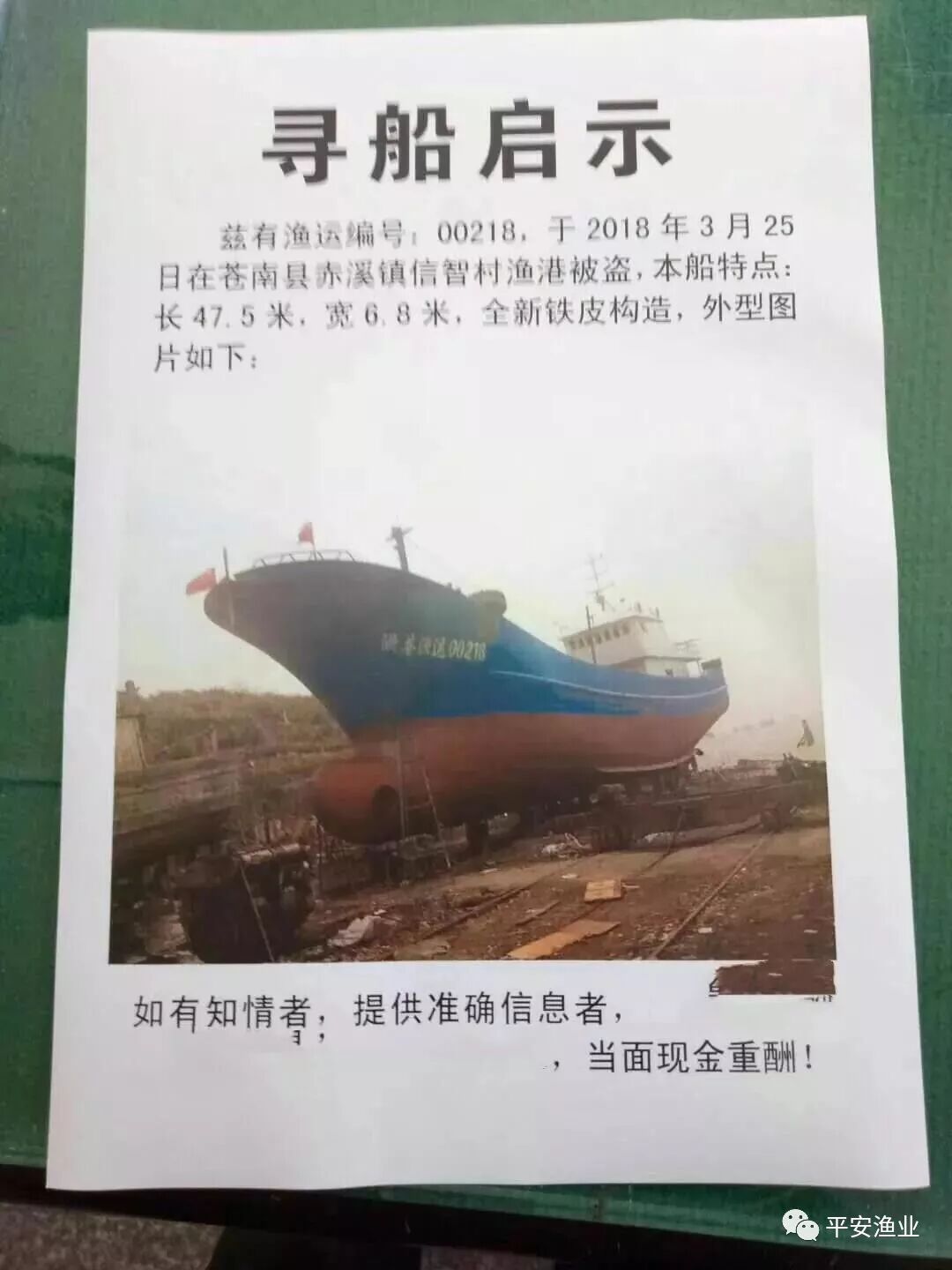 最近有一艘名为浙苍渔运00218的渔船在苍南县赤溪镇信智村渔港被盗,船主万分着急,随后贴出了一张寻船启示: