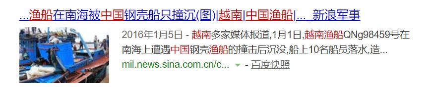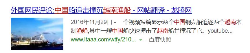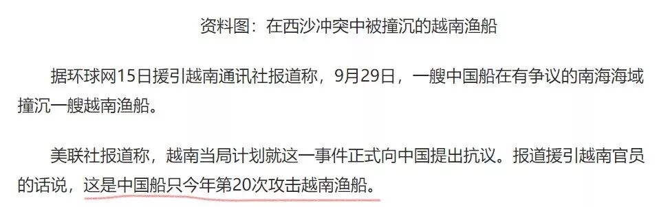 2014年5月27日下午4点,在中国海洋石油981钻井平台以南17海里处,一艘越南渔船被大约40艘中国渔船团团围住,其中船身编号11209的中国渔船,将一艘越南岘港市渔民的渔船撞沉,岘港市渔船上全部10名渔民已经获救,无人员伤亡。
